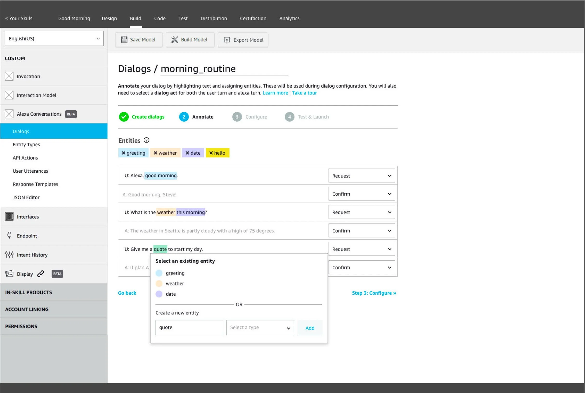 These early mockups explore a dialog-first approach to configuring user-spoken dialog, which a skill developer can easily scaffold their skill by annotating dialog acts, utterance sets, intents, and slots. These “sample dialogs” would then be used to train the skill models.