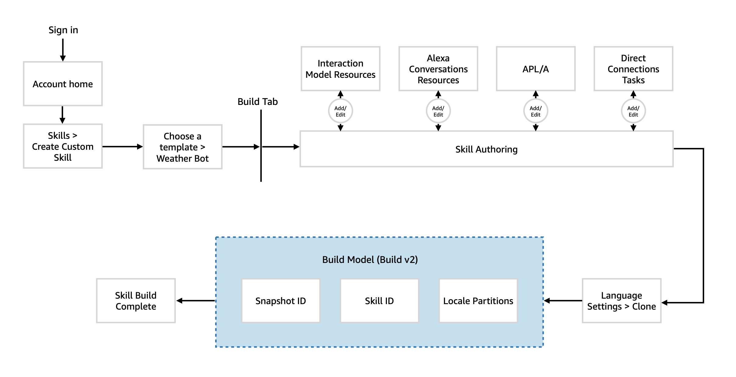 This high-level user flow highlights the typical entry, skill building activities, and publishing that an intermediate developer takes when creating a new Alexa Skill.
